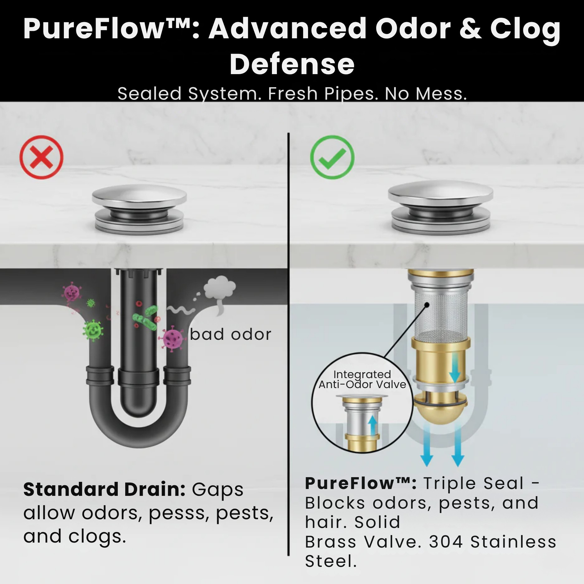 PureFlow™ is the simple, tool-free upgrade that keeps your drain flowing freely. It catches hair, dirt and jewelry before they block your drain no more clogs, odors or plumber calls. Cleaning takes seconds: lift out, rinse, pop back in. Fits all bathroom sinks. PureFlow™ turns a hassle into an effortless habit.