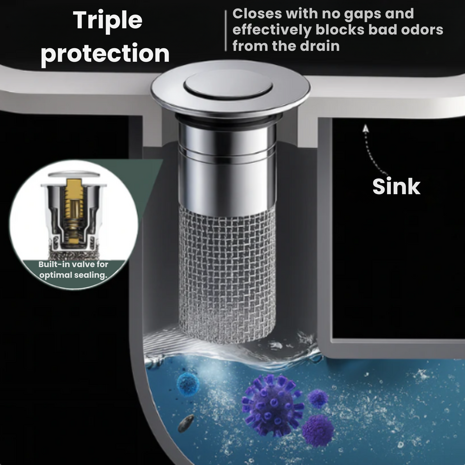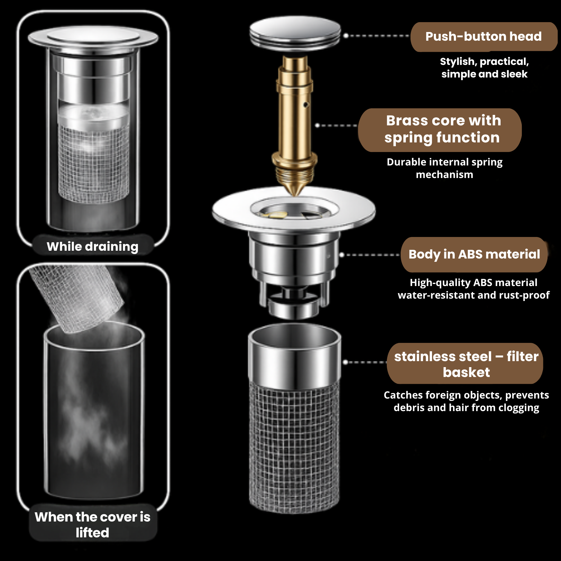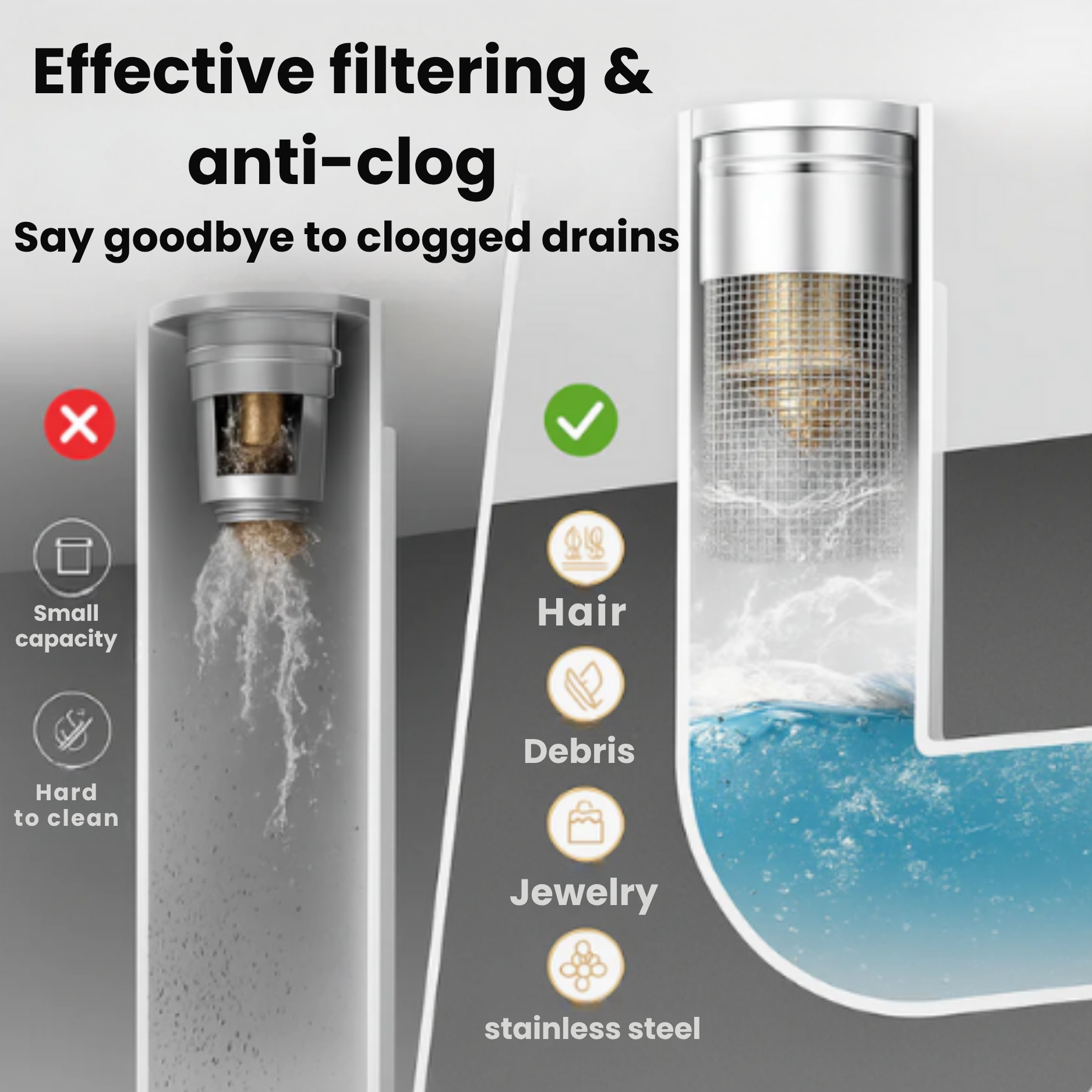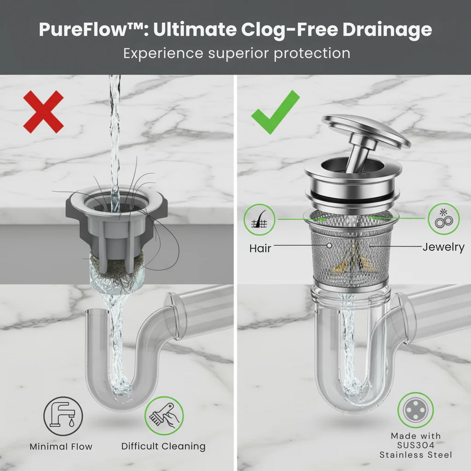 PureFlow™ ends the cycle. This all-metal filter catches hair and debris at the source no chemicals, no clogs, no plumber bills. Installs tool-free in 30 seconds, fits any sink, cleans with a twist.